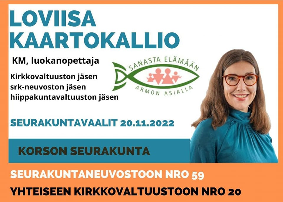 Seurakunnan tehtävä on julistaa evankeliumia, palvella ja auttaa sekä kutsua ihmisiä aktiivisesti osallistumaan ja rakentamaan seurakuntayhteisöä. Olen ehdolla seurakuntavaaleissa Korson seurakunnan seurakuntaneuvostoon ja Vantaan seurakuntien yhteiseen kirkkovaltuustoon. Ennakkoäänestys on 8.-12.11. ja varsinainen vaalipäivä on 20.11.